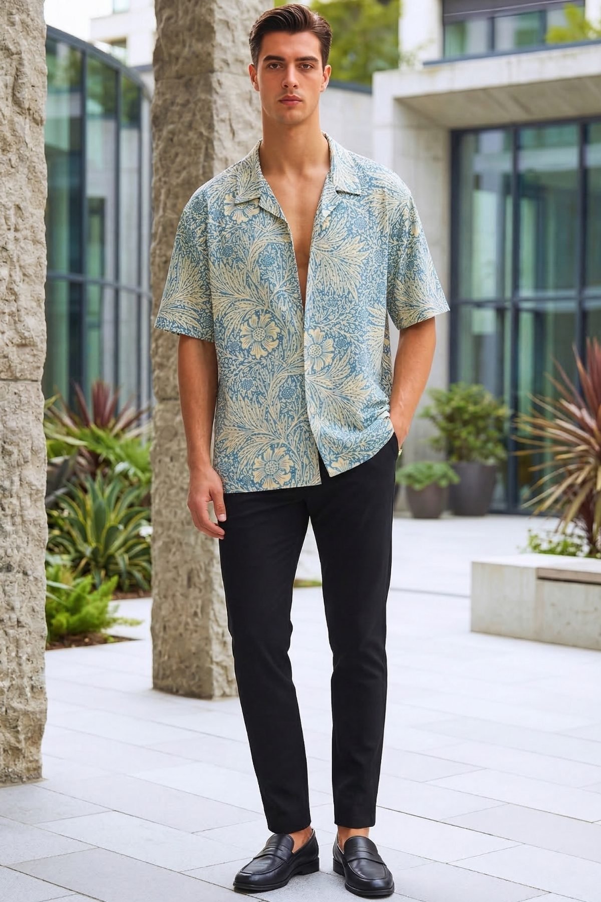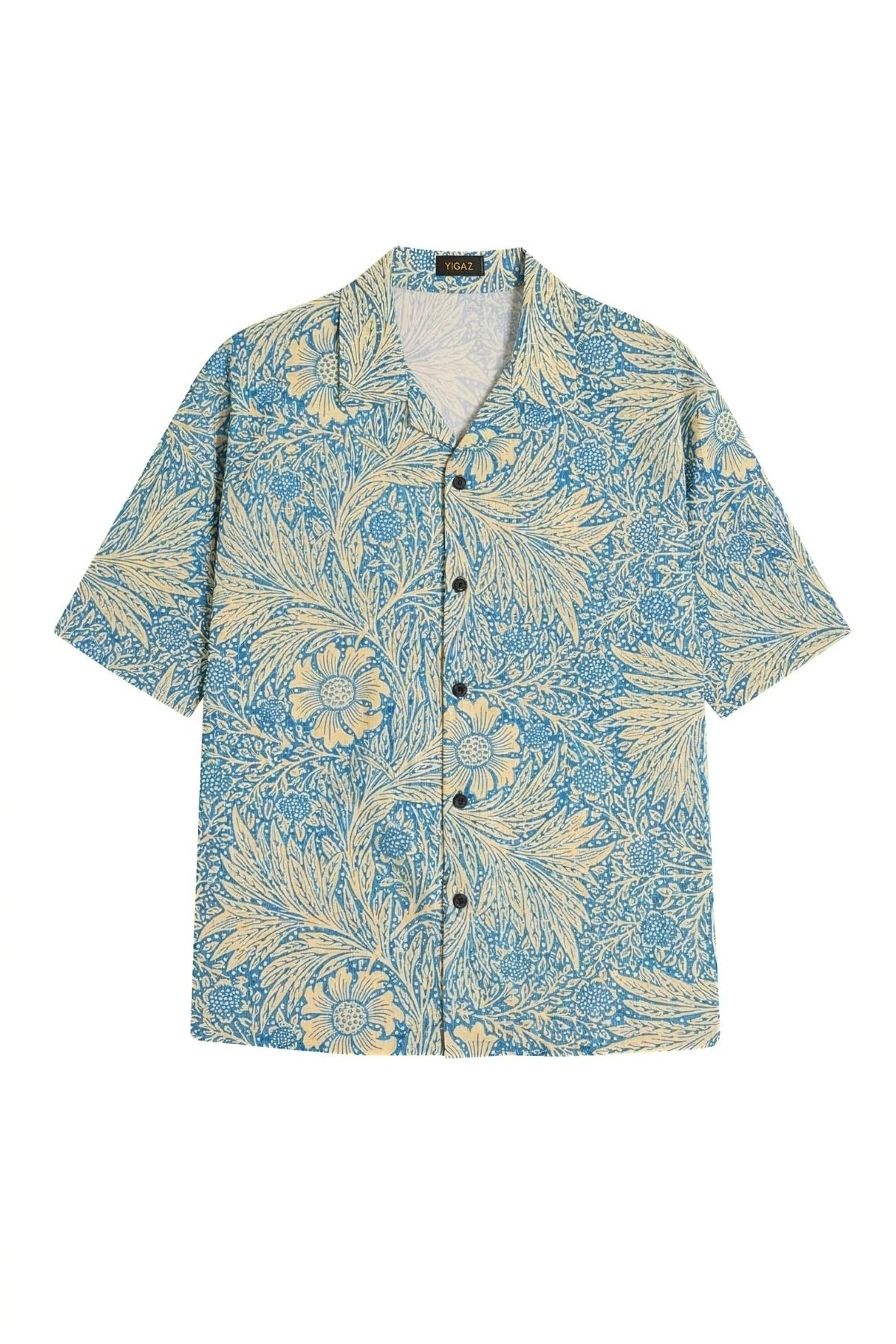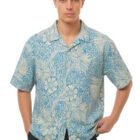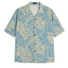 This shirt features an all-over, high-detail floral scroll print in a soothing cerulean blue and cream palette. The dense botanical illustrations provide a rich, textured look that feels artisanal and curated. Designed with our signature Cuban collar and a boxy, oversized fit, it offers a relaxed, sophisticated drape that transitions effortlessly from coastal getaways to urban settings.