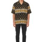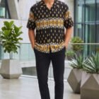 Let the pattern lead the way by pairing this with simple black tapered trousers or slim-fit chinos. To lean into the “resort-luxe” vibe, wear it unbuttoned over a black tank top with gold accessories to complement the mustard tones in the print.