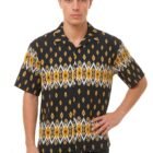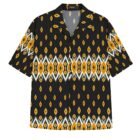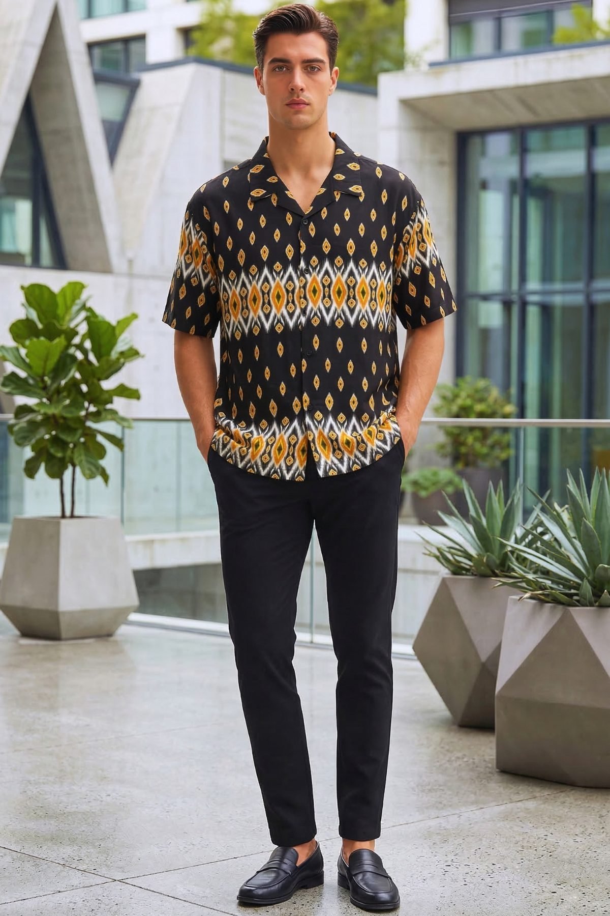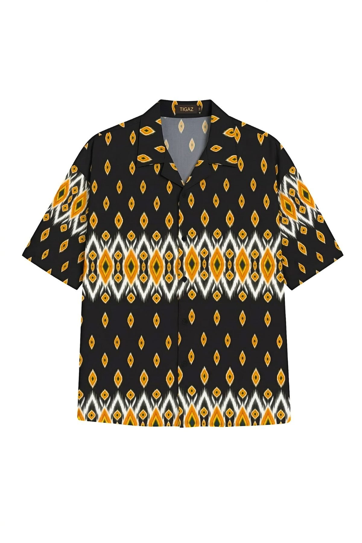 Drawing inspiration from intricate tribal textiles, this shirt features a sharp diamond-lattice print and a bold horizontal Ikat band. The high-contrast palette of deep charcoal black, mustard gold, and crisp white creates a powerful visual impact, while the oversized boxy cut ensures the look remains effortless and relaxed.
