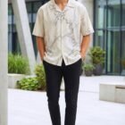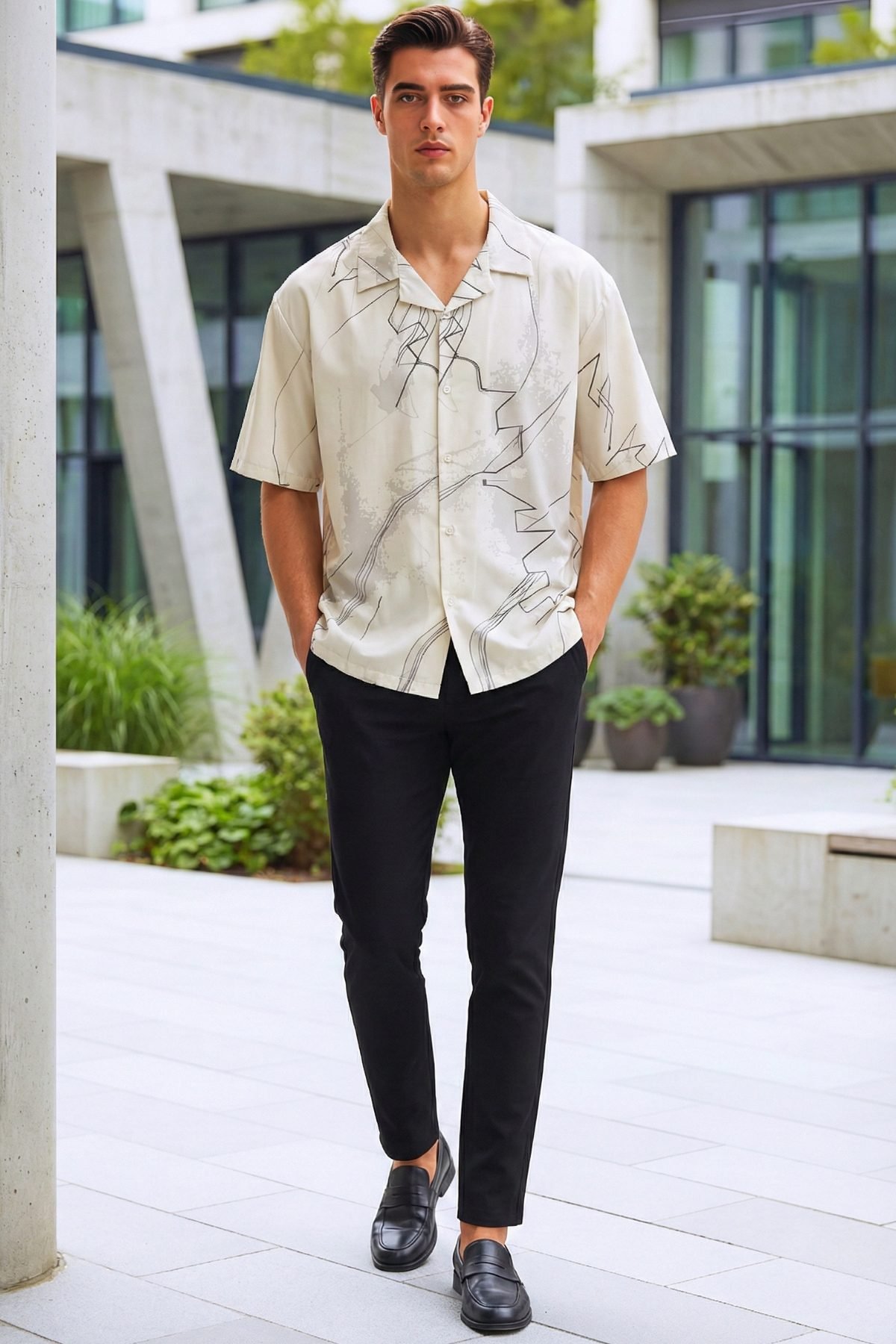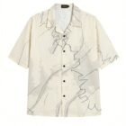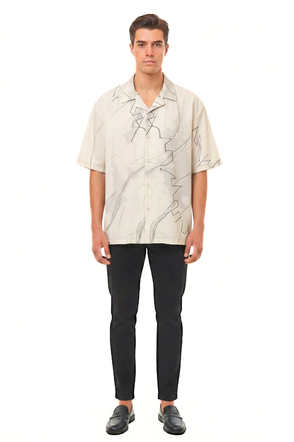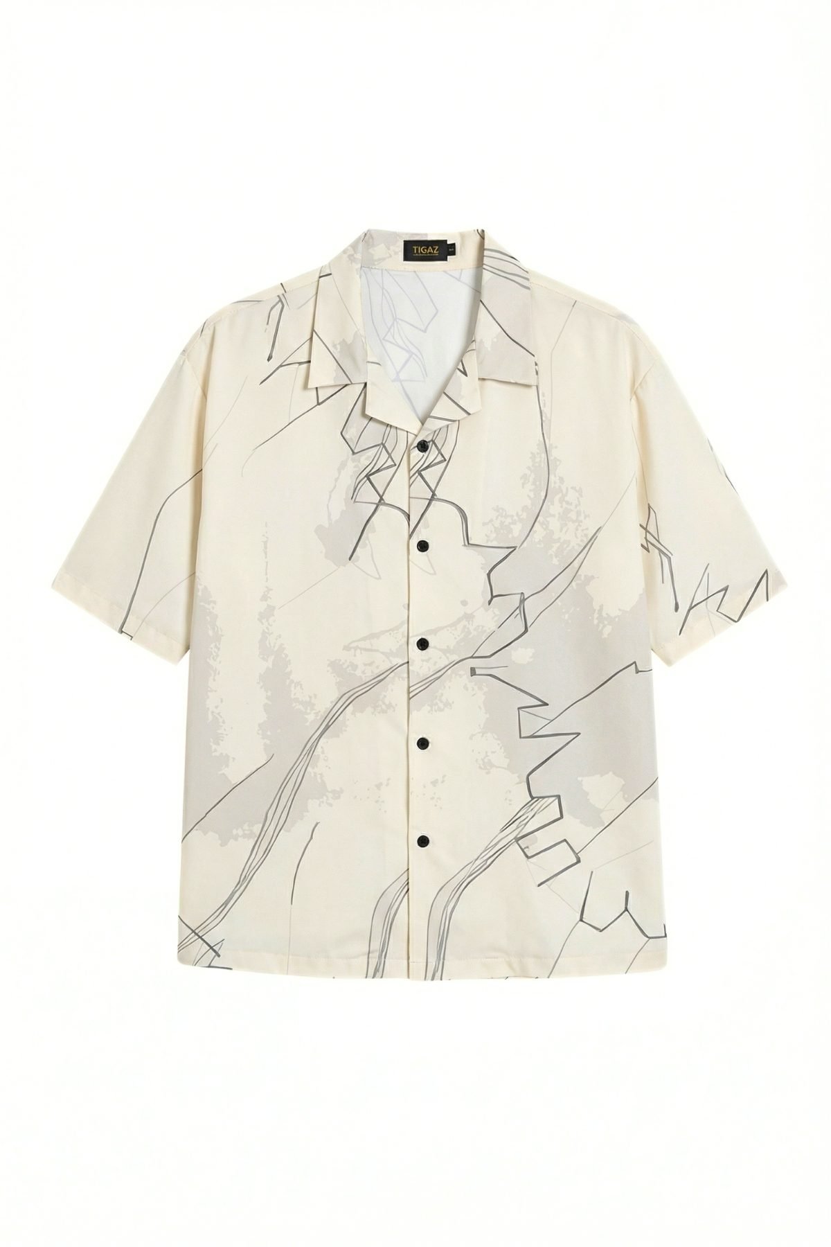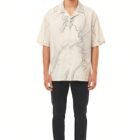 Against a soft ivory base, this shirt features a delicate yet structured overlay of charcoal linework and tonal grey “wash” textures. The oversized, boxy silhouette provides a spacious canvas for the print to flow naturally across the shoulders and chest. With its Cuban collar and relaxed drape, it’s a sophisticated choice for those who appreciate design-forward streetwear.