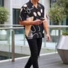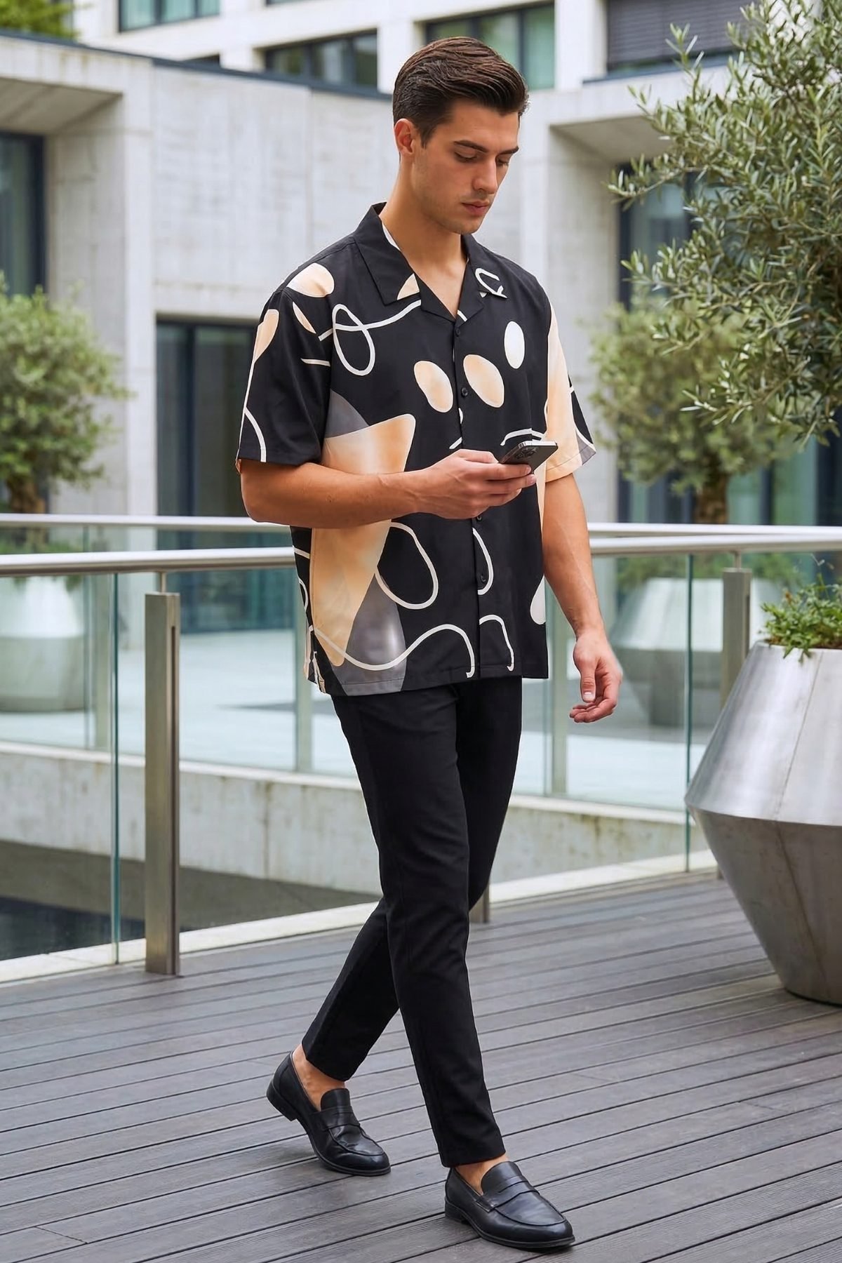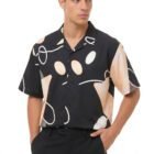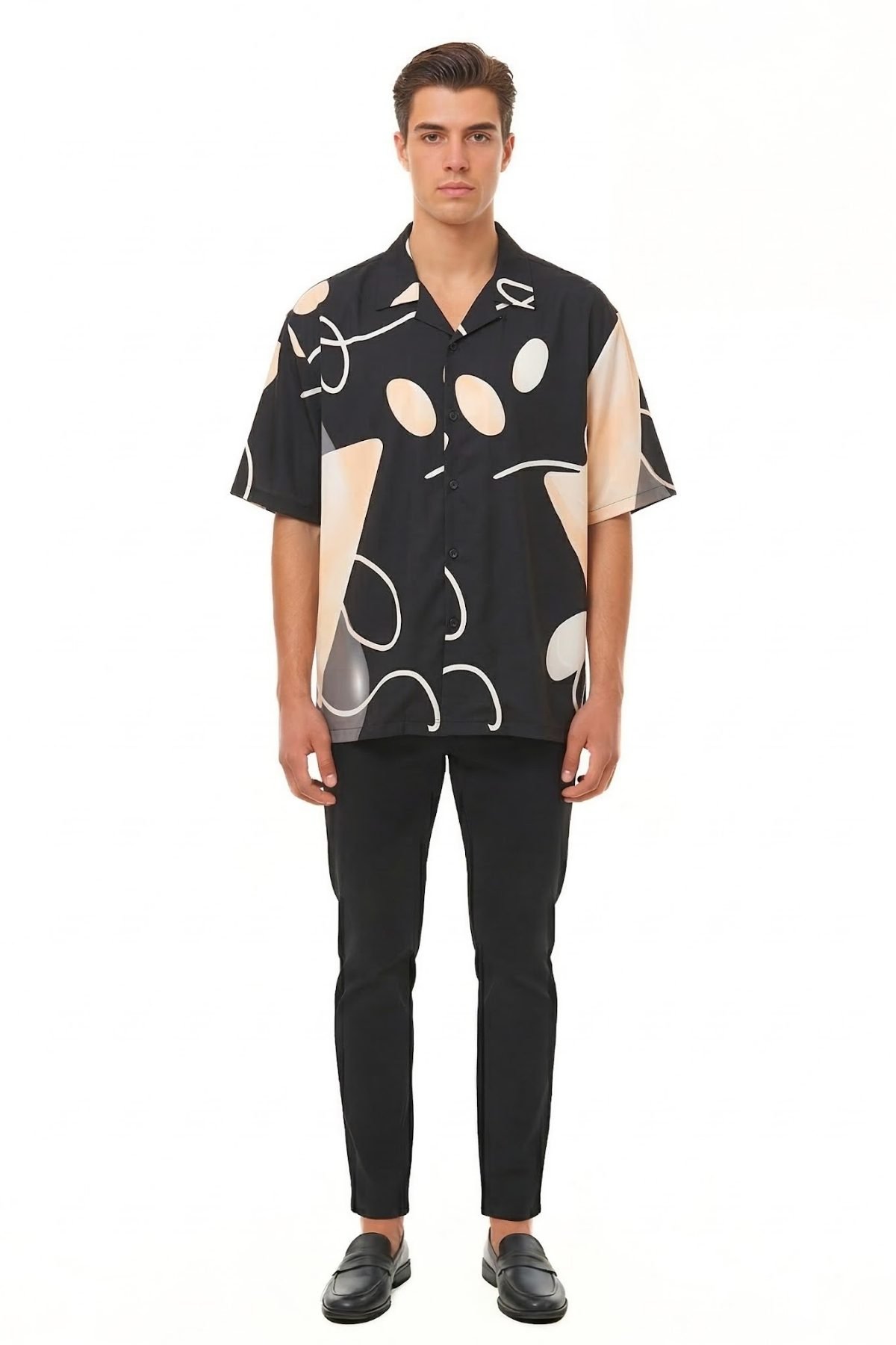 This shirt features a striking all-over botanical print in a vivid scarlet red, set against a deep midnight black canvas. The intricate floral patterns are accented by subtle geometric details, creating a rich visual depth that demands attention. Engineered with our signature oversized boxy fit and a relaxed Cuban collar, it offers a fluid drape and a sophisticated, contemporary silhouette.