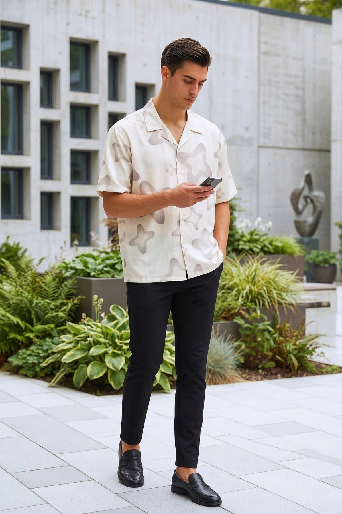 This shirt features a dynamic, all-over fracture print in a striking electric blue against a deep, dark canvas. The jagged, geometric lines create a sense of movement and energy, making it a standout statement piece for the urban explorer. Engineered with our signature oversized boxy fit and a relaxed Cuban collar, it offers a fluid drape and a comfortable, modern profile.