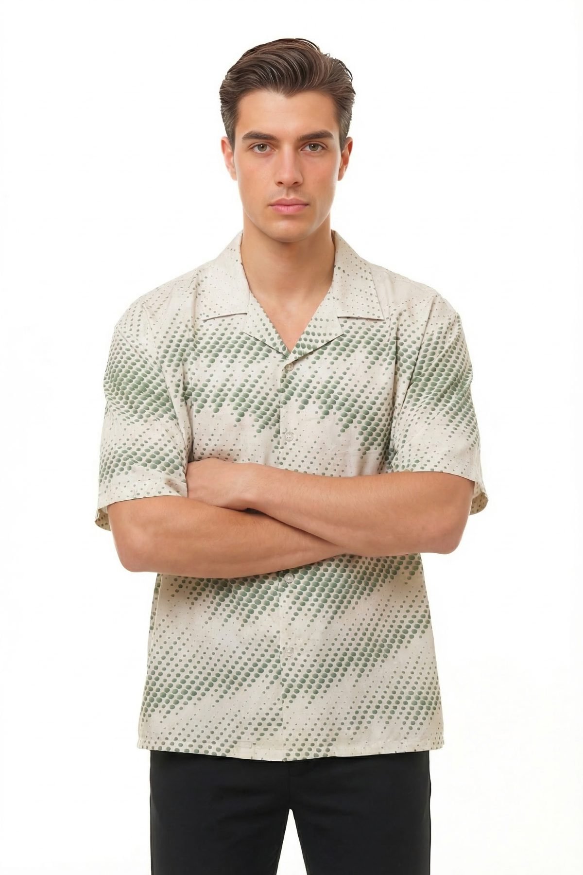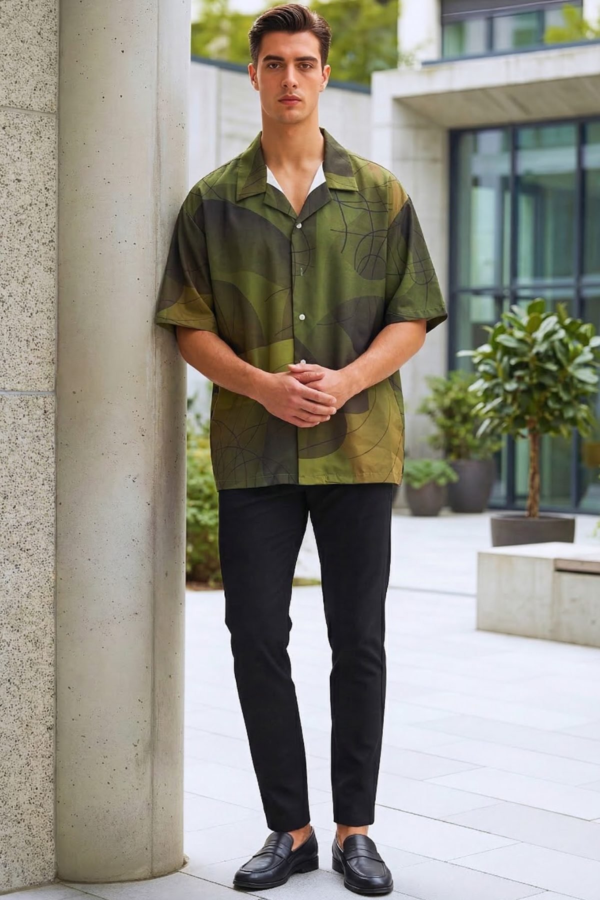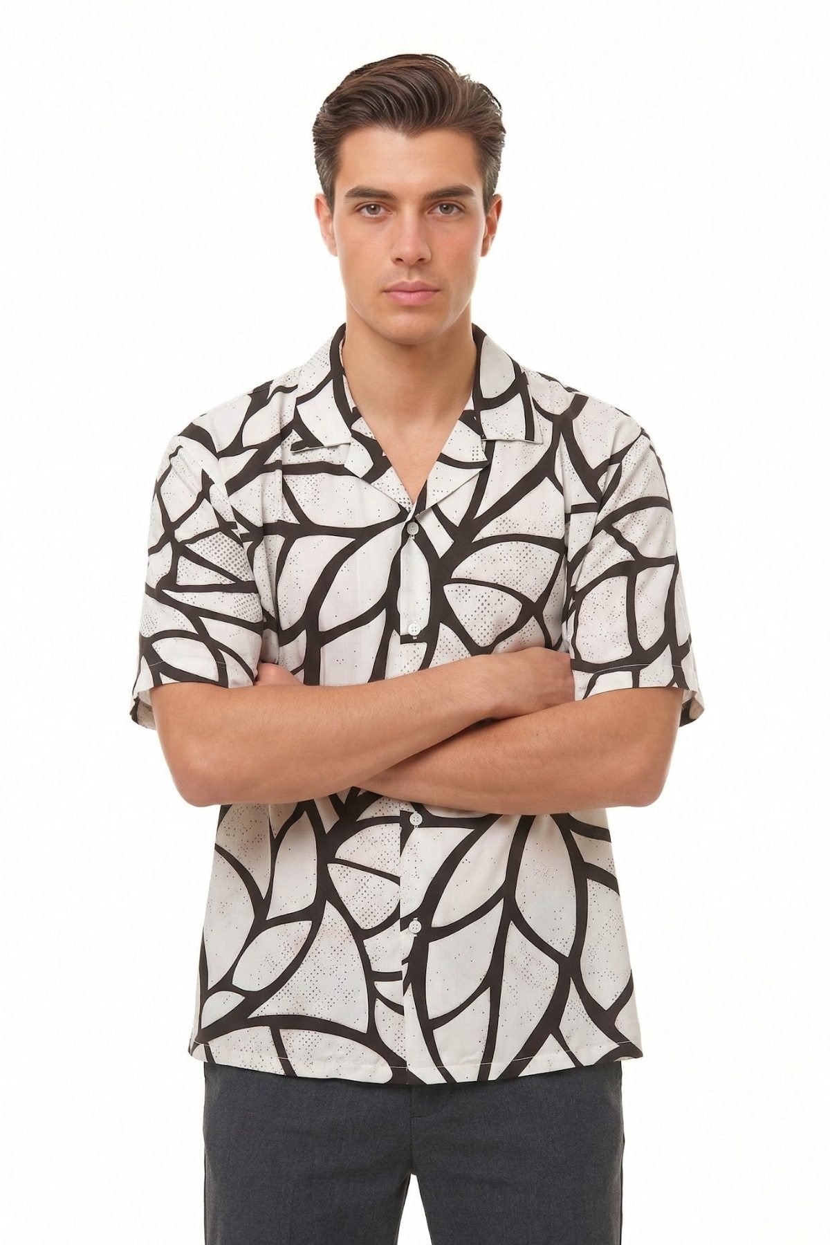 This shirt features a rhythmic, interlocking chain-link motif, where crisp cream lines weave across a midnight black canvas. The structured, architectural nature of the print offers a sense of premium sophistication, making it an ideal bridge between casual streetwear and high-fashion aesthetics. Engineered with our signature oversized boxy fit and a relaxed Cuban collar, it provides a spacious silhouette that feels effortless and intentional.